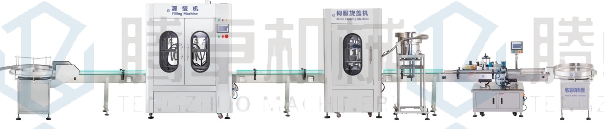 1.全自動生產(chǎn)線流程:人工把瓶放到送瓶轉(zhuǎn)盤上-自動灌裝-自動理蓋下蓋-自動旋蓋-自動打碼-自動貼標-人工收瓶