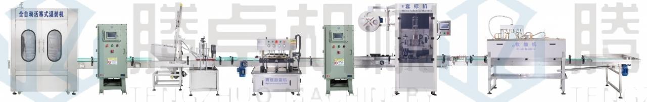 完成動作:人工放瓶-自動灌裝-機器放蓋-自動旋蓋–自動套標收縮-人工收瓶