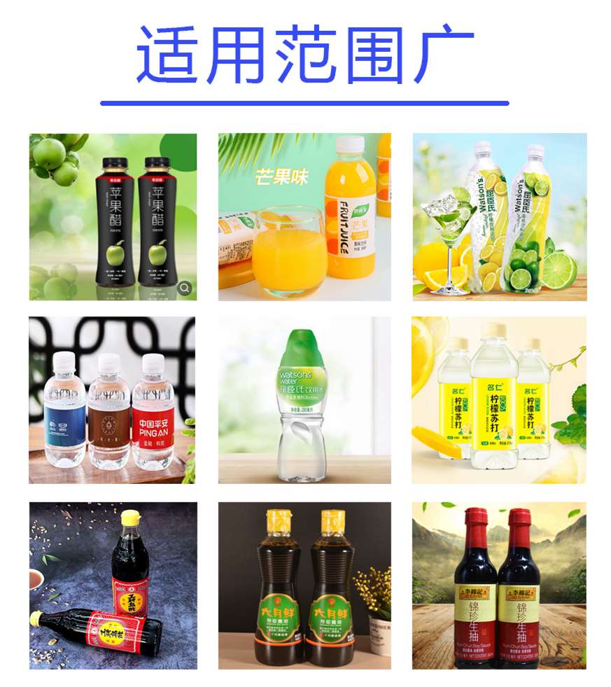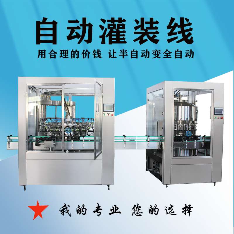 完成動(dòng)作:人工放瓶-自動(dòng)洗瓶灌裝-機(jī)器放蓋-自動(dòng)旋蓋–自動(dòng)貼標(biāo)套標(biāo)-人工收瓶或接自動(dòng)裝箱